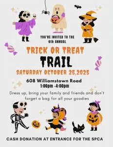 You are invited to the 6th annual Trick or Treat Trail at 608 Williamstown Road from 1 to 4 pm. Dress-up, bring your family and friends, and don’t forget a bag for all your goodies. All proceeds will be donated to the Miramichi SPCA.